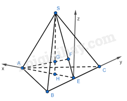 \( \Rightarrow GH = \frac{1}{4}SH = \frac{1}{4}.\frac{{a\sqrt 6 }}{3} = \frac{{a\sqrt 6 }}{{12}} \Rightarrow G(\frac{{a\sqrt 3 }}{6};0;\frac{{a\sqrt 6 }}{{12}})\)