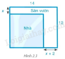 Bác An có một mảnh đất hình chữ nhật với chiều dài 14m và chiều rộng 12m. Bác dự định xây nhà trên mảnh đất đó và dành một phần diện tích đất để làm sân vườn như hình 2.3. Biết diện tích đất làm nhà là \(100{m^2}.\) Hỏi x bằng bao nhiêu mét?