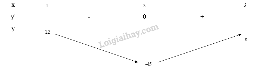 Từ bảng biến thiên, ta thấy \(\mathop {\max }\limits_{[ – 1;3]} y = y( – 1) = 12\) và \(\mathop {\min }\limits_{[ – 1;3]} y = y(2) =  – 15\)