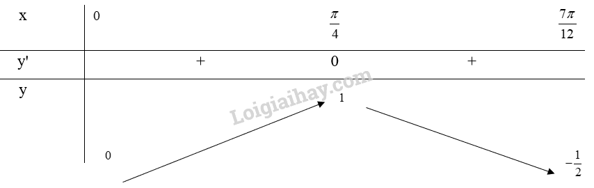 Từ bảng biến thiên, ta thấy \(\mathop {\max }\limits_{[0;\frac{{7\pi }}{{12}}]} y = y(\frac{\pi }{4}) = 1\) và \(\mathop {\min }\limits_{[0;\frac{{7\pi }}{{12}}]} y = y(\frac{{7\pi }}{{12}}) =  – \frac{1}{2}\)