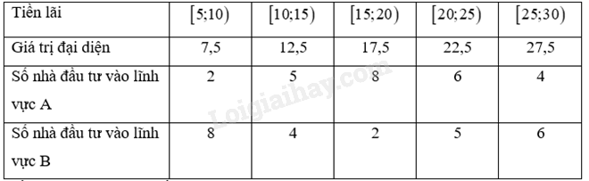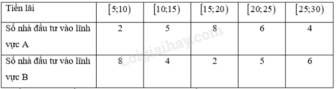 Người ta ghi lại tiền lãi (đơn vị: triệu đồng) của một số nhà đầu tư (với số tiền đầu tư như nhau), khi đầu tư vào hai lĩnh vực A, B cho kết quả như sau:
