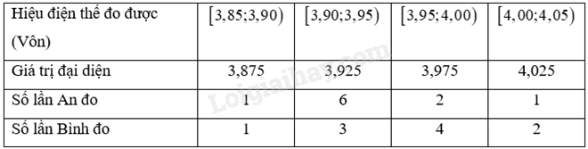 Trong bài thực hành đo hiệu điện thế của mạch điện, An và Bình đã dùng hai vôn kế khác nhau để đo, mỗi bạn tiến hành đo 10 lần cho kết quả như sau: Tính độ lệch chuẩn của các mẫu số liệu ghép nhóm cho kết quả số đo của An và Bình. Từ đó kết luận xem vôn kết của bạn nào cho kết quả ổn định hơn.