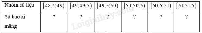 Kiểm tra khối lượng của 30 bao xi măng (đơn vị: kg) được chọn ngẫu nhiên trước khi xuất xưởng cho kết quả như sau: a) Thay dấu “?” bằng số thích hợp để hoàn thiện mẫu số liệu ghép nhóm sau. b) Tìm phương sai và độ lệch chuẩn của mẫu số liệu gốc và mẫu số liệu ghép nhóm. Giá trị nào là giá trị chính xác? Giá trị nào là giá trị xấp xỉ?