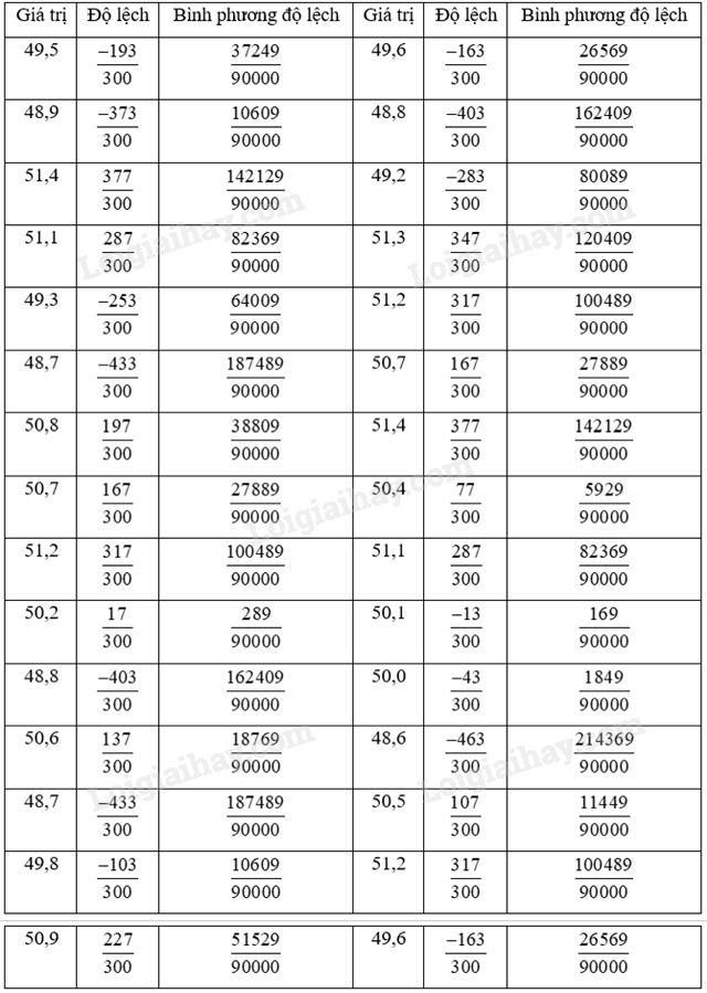 Giá trị trung bình: \(\overline x  = \frac{{48,75.6 + 49,25.2 + 49,75.4 + 50,25.4 + 50,75.6 + 51,25.8}}{{30}} = \frac{{3011}}{{60}}\)