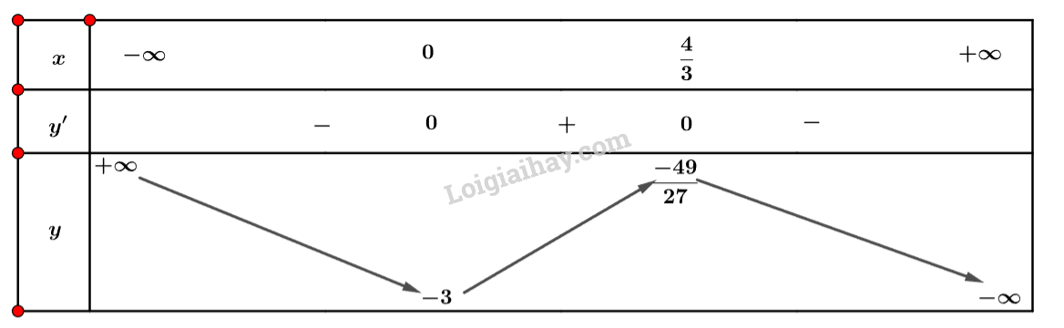 Nhận xét \(y’ = 0 \Leftrightarrow \left[ \begin{array}{l}x = 0\\x = \frac{4}{3}\end{array} \right.\)