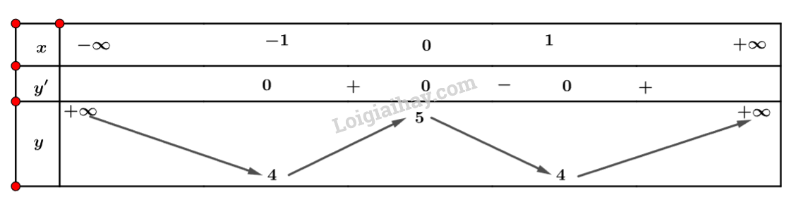Nhận xét \(y’ = 0 \Leftrightarrow \left[ \begin{array}{l}x = 0\\x =  \pm 1\end{array} \right.\)