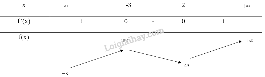 Hàm số đạt cực đại tại x = -3, \({y_{cd}} = f( – 3) = 82\), đạt cực tiểu tại x = 2, \({y_{ct}} = f(2) =  – 43\)