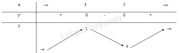 Từ bảng biến thiên ta thấy, hàm số đạt cực đại tại x = 3 và \({y_{cd}} = 2\), đạt cực tiểu tại x = 5 và \({y_{ct}} = 6\)