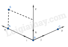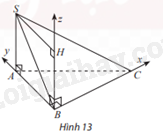 Cho tứ diện SABC có ABC là tam giác vuông tại B, BC = 3, BA = 2, SA vuông góc với mặt phẳng (ABC) và có độ dài bằng 2 (Hình 13). a) Xác định một hệ toạ độ dựa trên gợi ý của hình vẽ và chỉ ra các vectơ đơn vị trên các trục toạ độ. b) Tìm toạ độ các điểm A, B, C, S.