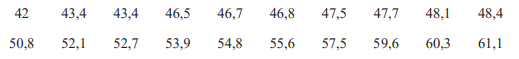 Số trung bình: \(\overline x  = \frac{{42 + 43,4 + … + 61,1}}{{20}} = 50,945\)