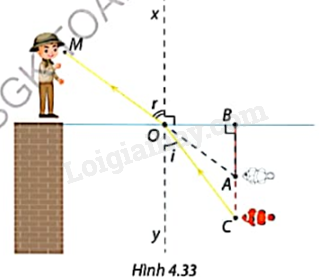 Khi tia sáng được truyền qua mặt phân cách giữa không khí và nước thì đường đi tia sáng sẽ bị lệch đi do hiện tượng khúc xạ ánh sáng. Góc tới i và góc khúc xạ r như Hình 4.33 liên hệ với nhau theo công thức \(\frac{{\sin i}}{{\sin r}} = \frac{3}{4}\). Một con cá bơi ở vị trí C. Do ánh sáng bị khúc xạ nên Minh đứng trên bờ nhìn xuống nước với góc \(r = {54^o}\) thì thấy con cá ở vị trí A thẳng hàng với O, M và cách mặt nước một đoạn \(AB = 71cm\).