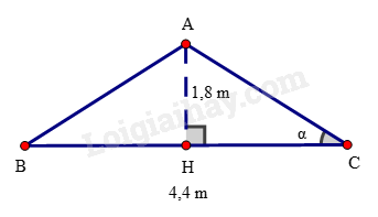 Tam giác AHC vuông tại H nên ta có: \(\tan \alpha  = \frac{{AH}}{{HC}} = \frac{{1,8}}{{2,2}} = \frac{9}{{11}}\)