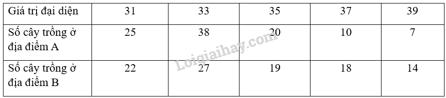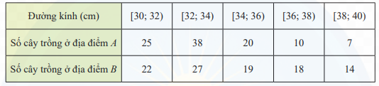 Một giống cây xoan đào được trồng tại hai địa điểm A và B. Người ta thống kê đường kính thân của một số cây xoan đào 5 năm tuổi ở bảng sau: a) Hãy so sánh đường kính trung bình của thân cây xoan đào trồng tại địa điểm A và địa điểm B. b) Nếu so sánh theo độ lệch chuẩn thì cây trồng tại địa điểm nào có đường kính đồng đều hơn?