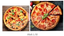 Có hai chiếc bánh pizza hình tròn (H.5.18). Chiếc bánh thứ nhất có đường kính 16 cm được cắt thành 6 miếng đều nhau có dạng hình quạt tròn. Chiếc bánh thứ hai có đường kính 18 cm được cắt thành 8 miếng đều nhau có dạng hình quạt tròn. Hãy so sánh diện tích bề mặt của hai miếng bánh cắt ra từ chiếc bánh thứ nhất và thứ hai.