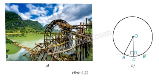 Có thể xem guồng nước (còn gọi là cọn nước) là một công cụ hay cỗ máy có dạng hình tròn, quay được nhờ sức nước chảy (H.5.22a). Guồng nước thường thấy ở các vùng miền núi. Nhiều guồng nước được làm bằng tre, dùng để đưa nước lên ruộng cao, giã gạo hoặc làm một số việc khác. Giả sử ngấn nước ngăn cách giữa phần trên và phần dưới của một guồng nước được biểu thị bởi cung ứng với một dây dài 4 m và điểm ngập sâu nhất là 0,5 m (trên hình 5.22b, điểm ngập sâu nhất là điểm C, ta có AB = 4 m và HC = 0