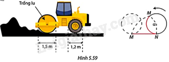 Một chiếc xe lu có đường kính trống lu là 1,5m và đường kính của bánh sau là 1,2m (Hình 5.59). Khi hoạt động, trống lu quay hết một vòng \(\left( {{{360}^o}} \right)\) trong 5 phút.
