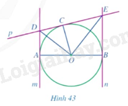 Cho đường tròn \(\left( {O;R} \right)\) đường kính \(AB\) và các đường thẳng \(m,n,p\) lần lượt tiếp xúc với đường tròn tại \(A,B,C\) (Hình 43). Chứng minh: a) \(AD + BE = DE\); b) \(\widehat {COD} = \frac{1}{2}\widehat {COA}\) và \(\widehat {COE} = \frac{1}{2}\widehat {COB}\); c) Tam giác \(ODE\) vuông; d) \(\frac{{OD.OE}}{{DE}} = R\).