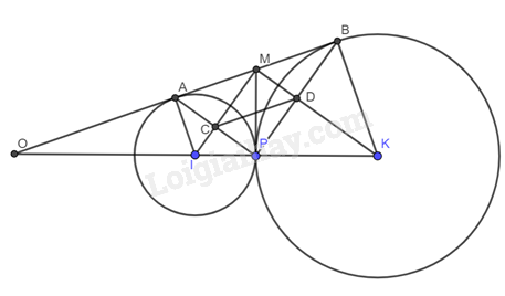 Cho hai đường tròn \(\left( {I;r} \right)\) và \(\left( {K;R} \right)\) tiếp xúc ngoài với nhau tại \(P\) với \(R \ne r\), đường thẳng \(a\) lần lượt tiếp xúc với \(\left( {I;r} \right)\) và \(\left( {K;R} \right)\) tại \(A\) và \(B,a\) cắt \(KI\) tại \(O\). Đường thẳng qua \(P\) vuông góc với \(IK\) cắt đường thẳng \(a\) tại \(M\). Chứng minh: