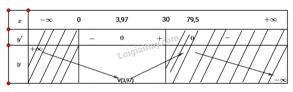 Nhận xét \(V’\left( T \right) = 0 \Leftrightarrow \left[ \begin{array}{l}T \approx 79,5\\T \approx 3,97\end{array} \right.\).
