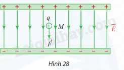 Trong điện trường đều, lực tĩnh điện \(\overrightarrow F \) (đơn vị: N) tác dụng lên điện tích điểm có điện tích q (đơn vị: C) được tính theo công thức \(\overrightarrow F  = q.\overrightarrow E \), trong đó \(\overrightarrow E \) là cường độ điện trường (đơn vị: N/C). Tính độ lớn của lực tĩnh điện tác dụng lên điện tích điểm khi \(q = {10^{ – 9}}C\) và độ lớn điện trường \(E = {10^5}\) N/C (Hình 28).
