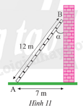Một cái thang dài 12m được đặt dựa vào một bức tường sao cho chân thang cách tường 7m (Hình 11). Tính góc \(\alpha \) tạo bởi thang và tường.