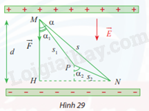 Một lực tĩnh điện \(\overrightarrow F \) tác động lên điện tích điểm M trong điện trường đều làm cho M dịch chuyển theo đường gấp khúc MNP (Hình 29). Biết \(q = {2.10^{ – 12}}C\), vectơ điện trường có độ lớn \(E = 1,{8.10^5}\)N/C và d = MH = 5mm. Tính công A sinh bởi lực tĩnh điện \(\overrightarrow F \).