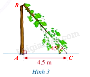 Giông bão thổi mạnh, một cây bị gãy gập xuống làm ngọn cây chạm đất và tạo với phương năm ngang một góc \(45^\circ \) (minh họa ở Hình 3). Người ta đo được khoảng cách từ chỗ ngọn cây chạm đất đến gốc cây là \(4,5m\). Giả sử cây mọc vuông góc với mặt đất, hãy tính chiều cao của cây đó theo đơn vị mét (làm tròn kết quả đến hàng phần mười).