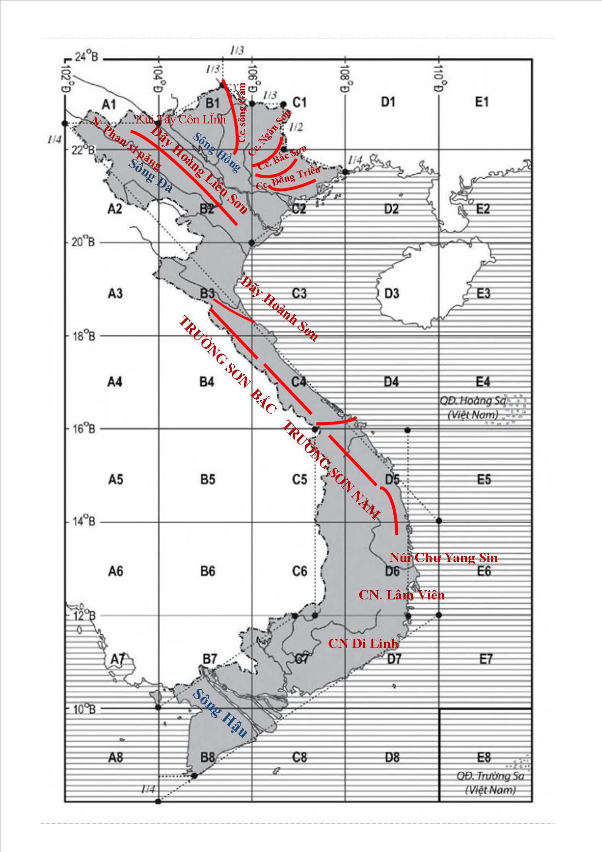 Điền tên các dãy núi, các cánh cung, các đỉnh núi, các cao nguyên, các con sông trên lược đồ.