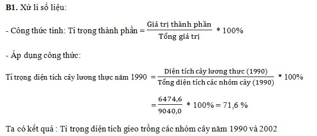 Cho bảng số liệu: a) Hãy vẽ biểu đồ hình tròn thể hiện cơ cấu diện tích gieo trồng các nhóm cây. Biểu đồ năm 1990 có bán kính là 20 mm; biểu đồ năm 2002 có bán kính là 24 mm. b)Từ bảng số liệu và biểu đồ đã vẽ, hãy nhận xét về sự thay đổi quy mô diện tích và tỉ trọng diện tích gieo trồng của các nhóm cây.