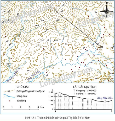 1. Quan sát hình 12.1, trả lời các câu hỏi sau: – Khu vực này có dạng địa hình gì? – Độ cao lớn nhất của địa hình ở khu vực này là bao nhiêu mét? – Sông Nậm Rốm bắt nguồn ở độ cao bao nhiêu mét? – Các bản làng nằm tập trung ở độ cao khoảng bao nhiêu mét? – Hướng nghiêng của địa hình là hướng nào? 2. Đoạn thẳng nối từ A đến B là lát cắt địa hình ở khu vực này. Quan sát lát cắt A – B, trả lời các câu hỏi sau: …
