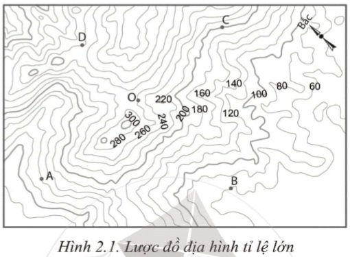 Xác định hướng từ O đến A, từ O đến B, từ O đến C, từ O đến D dựa vào mũi tên chỉ hướng bắc trong hình 2.1.