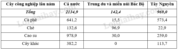 Căn cứ vào bảng số liệu và yêu cầu đề bài => Biểu đồ cột chồng là biểu đồ thích hợp nhất thể hiện diện tích cây công nghiệp lâu năm của cả nước, Trung du và miền núi Bắc Bộ, Tây Nguyên năm 2014.