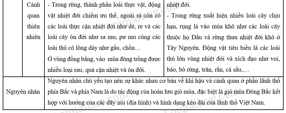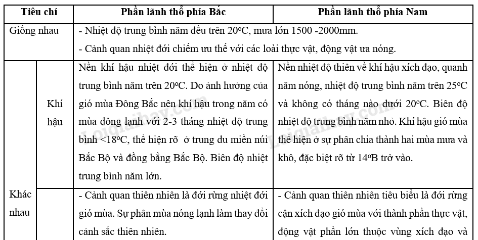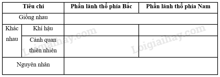 Dựa vào kiến thức đã học, hãy  so sánh đặc điểm thiên nhiên phần lãnh thổ phía Bắc và phần lãnh thổ phía Nam bằng cách hoàn thành bảng sau: