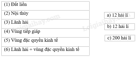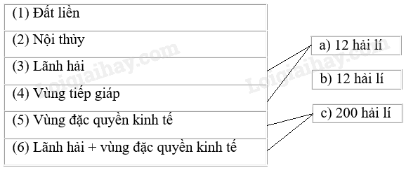 Nối ô chữ ở bên trái với ô chữ ở bên phải trong sơ đồ sau sao cho phù hợp với Luật quốc tế về biển năm 1982 và Tuyên bố của Chính phủ Việt Nam về chủ quyền vùng biển của đất nước.
