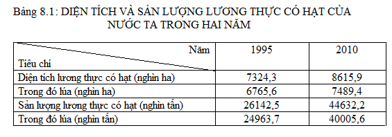 – Năm 1995 trong tổng diện tích cây lương thực có hạt diện tích cây lúa chiếm 92,4% trong khi sản lượng đạt tới 95,5% tổng sản lượng cây lương thực có hạt ở nước ta.