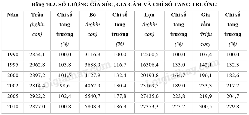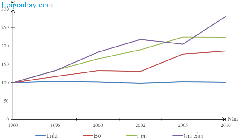Thời kì 1990 – 2002, số lượng đàn gia súc, gia cầm của nước ta đều tăng nhưng tốc độ tăng khác nhau.