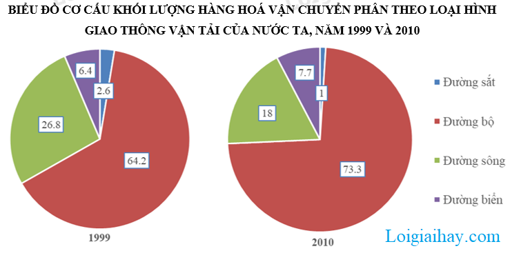 Qua hai biểu đồ, ta thấy sự thay đổi tỉ trọng rõ rệt của các ngành giao thông vận tải từ năm 1999 đến 2010. Cụ thể:
