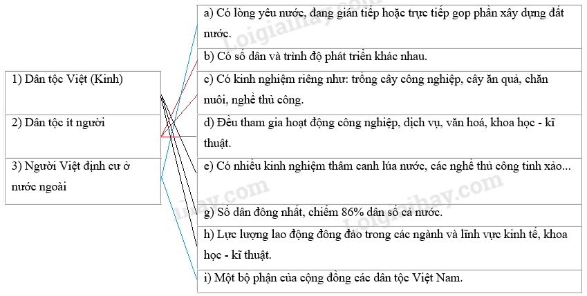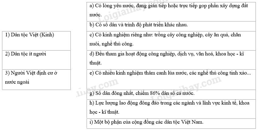 Giải câu 2 trang 6 SBT địa 9, Nối ô chữ ở bên trái với các ô chữ ở bên phải sao cho phù hợp với đặc điểm các dân tộc ở Việt Nam.