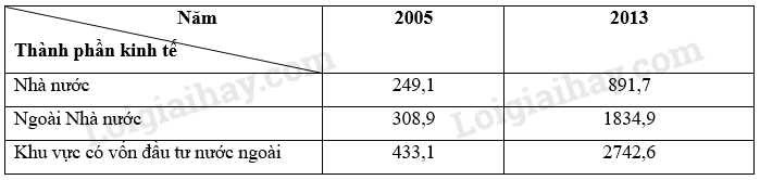 GIÁ TRỊ SẢN XUẤT CÔNG NGHIỆP (GIÁ THỰC TẾ) PHÂN THEO THÀNH PHẦN KINH TẾ CỦA NƯỚC TA NĂM 2005 VÀ NĂM 2013 (Đơn vị: nghìn tỉ đồng)