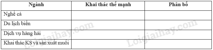 Dựa vào hình 36 SGK, Atlat Địa lí Việt Nam và kiến thức đã học, điền vào bảng sau các thế mạnh và sự phân bố các ngành kinh tế biển ở Duyên hải Nam Trung Bộ