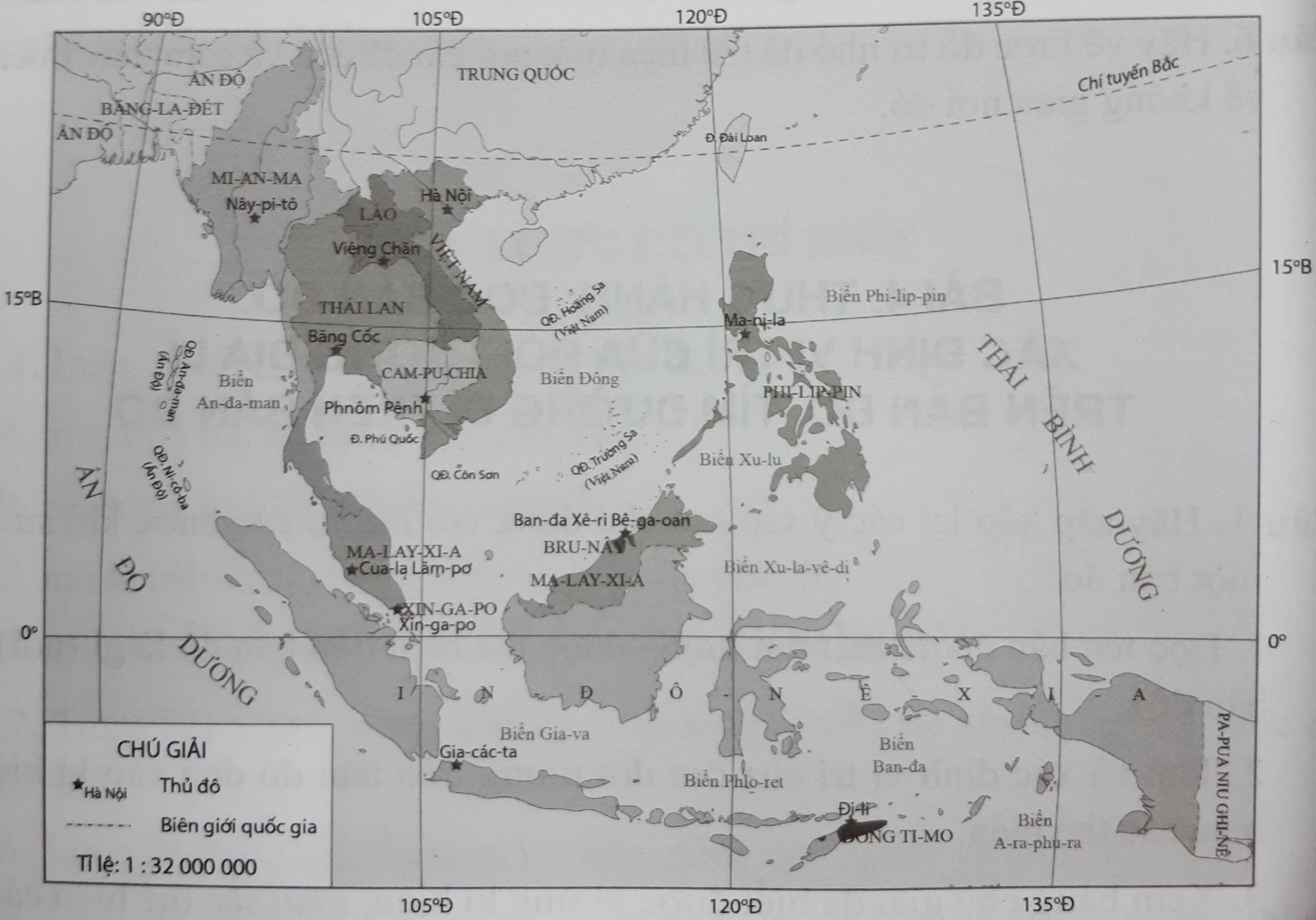 a) 11 nước và thủ đô của các nước trong khu vực Đông Nam Á: Hà Nội (Việt Nam), Nây-pi-tô (Mi-an-ma), Băng Cốc (Thái Lan), Viêng Chăn (Lào), Phnôm Pênh (Cam-pu-chia), Cua-la Lăm-pơ (Ma-lay-xi-a), Xin-ga-po (Xin-ga-po), Ma-ni-la (Phi-lip-pin), Ban-đa Xê-ri Bê-ga-oan (Bru-nây), Đi-li (Đông-ti-mo), Gia-các-ta (In-đô-nê-xi-a).