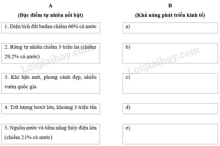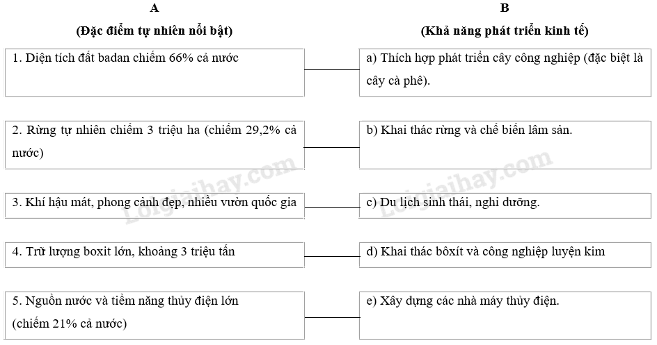 Giải câu 3 trang 68 sách bài tập Địa lí 9, Điền nội dung thích hợp vào các ô trống ở cột B để nêu rõ thế mạnh kinh tế của điều kiện tự nhiên ở Tây Nguyên.