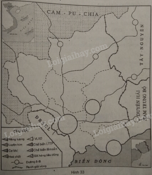 Giải câu 4 trang 81 sách bài tập Địa lí 9, Dựa vào hình 33 dưới đây, em hãy: a) Ghi các địa danh Đồng Xoài, thủ Dầu Một, Bà Rịa, Tây Ninh vào đúng vị trí tên lược đồ.
