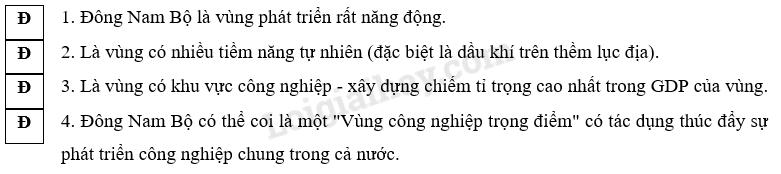 Ghi chữ Đ vào ô ý trả lời đúng về vai trò của vùng Đông Nam Bộ trong phát triển công nghiệp của cả nước.