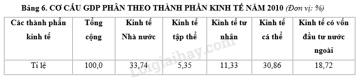 Giải câu 5 trang 21 SBT địa 9, Cho bảng 6: a) Vẽ biểu đồ cơ cấu GDP phân theo thành phần kinh tế nước ta, năm 2010. b) Nhận xét về cơ cấu GDP phân theo thành phần kinh tế ở nước ta.