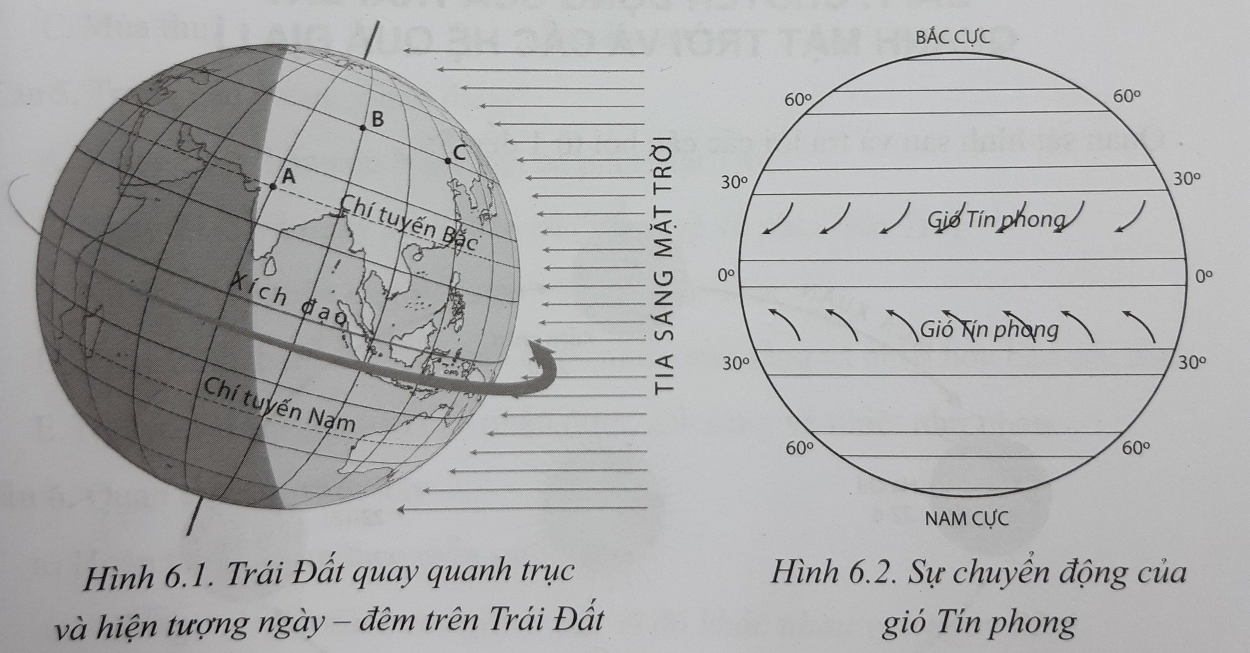 Quan sát hình 6.1. hãy: a) Trình bày chuyển động của Trái Đất quanh trục. b) Cho biết trong các địa điểm A, B và C, địa điểm nào sẽ đón bình minh sớm hơn. Tại sao?