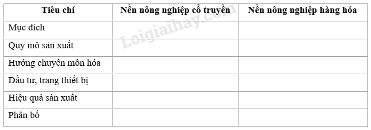 Hoàn thành bảng so sánh những nét khác nhau cơ bản giữa nền nông nghiệp cổ truyền và nền nông nghiệp hàng hóa: