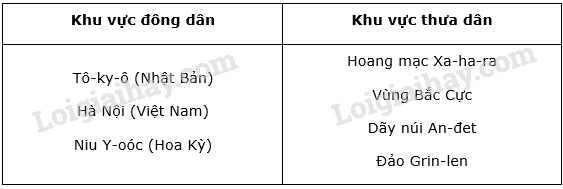 Cho các địa điểm sau: Tô-ky-ô (Nhật Bản), hoang mạc Xa-ha-ra, vùng Bắc Cực, dãy núi An-đet, Hà Nội (Việt Nam), Niu Y-oóc (Hoa Kỳ), đảo Grin-len. a) Hãy sắp xếp các địa điểm trên tương ứng với khu vực đông dân và thưa dân vào bảng theo mẫu sau: b) Tại sao dân cư thế giới lại phân bố không đều?