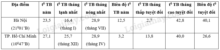 – Nhiệt độ trung bình cao tuyệt đối của Hà Nội cao hơn TP. Hồ Chí Minh nhưng nhiệt độ trung bình thấp tuyệt đối của Hà Nội lại thấp hơn TP. Hồ Chí Minh nên biên độ nhiệt tuyệt đối của Hà Nội cũng cao hơn TP. Hồ Chí Minh (40,10C so với 26,20C).