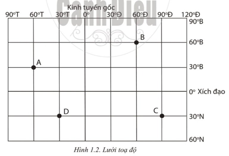 Hãy viết tọa độ địa lí của các điểm A, B, C, D trong hình 1.2.